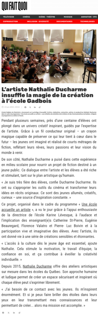 Voici un article paru dans le QUI FAIT QUOI du 23 juin dernier. Merci à Nathalie Ducharme, artiste invitée, qui a accompagné nos élèves et leurs enseignantes à créer des récits originaux, transposés en vidéos.