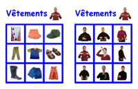 | Jeu de Loto: Les vêtementsNiveau: PréscolaireObjectif: associer le signe et le vêtement.Matériel:2 planches de jeu « vêtements » 2 planchea de jeu « signes » 18 cartes à découper « signes » 18 cartes à découper « vêtements » |